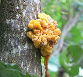 Saw this amazing sight on a tree-trunk (species unknown) the other day - it was just too high up to touch and at first I thought it was some kind of fungus. After such a wet, Wet season they are everywhere and come in all sorts of shapes, colours and sizes. But it almost looks as if there's a sort of drip-effect at the bottom so perhaps it's a resin oozing out of the trunk.